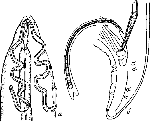 проксимального конца к дистальному, принимая форму заостренного клина. Длина ее равна 0,1496 мм. Для проверки диагноза Озерская имела D. spiralis от курицы. При просмотре этого материала было отмечено, что в величине и форме изгибов шейных канатиков по сравнению с экземпляром от скворца имелось некоторое отклонение; так, у D. spiralis курицы они не давали таких сильных изгибов, а имели слабую волнистость, длина нисходящих ветвей их превышала длину канатиков паразита скворца. С другой же стороны, такая вариация замечалась и у отдельных экземпляров D. spiralis курицы.