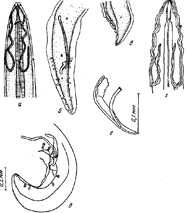а — головной конец; б — задний конец самца; в — хвостовой конец самки; г — головной конец; д — хвостовой конец самца; е — спикулы