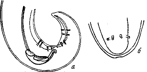 а — хвостовой конец самца латерально; б — хвостовой конец самца вентрально
