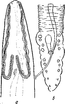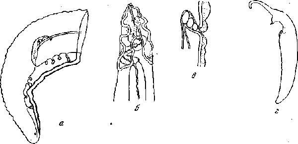 а — хвостовой конец самца; б — головной конец; в — область вульвы; г — малая спикула