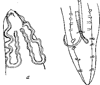 Кутикулярные канатики, резко извиваясь, направляются вначале назад, затем образуют петлю и возвращаются кпереди на некоторое расстояние, не коммуницируя друг с другом. Имеются 2 латеральные сосочковидные губы с 2 небольшими сосочками на каждой губе у их основания.
