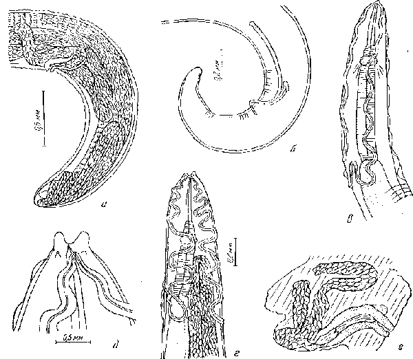 a — задний конец самки; б — задний конец самца; в — передний конец самца латерально; г — передний конец самки дорзально; д — головной конец; е — область вульвы