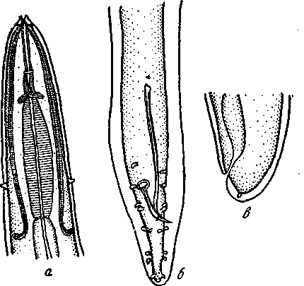 а — передний конец; б — задний конец самца; в — хвостовой конец самки