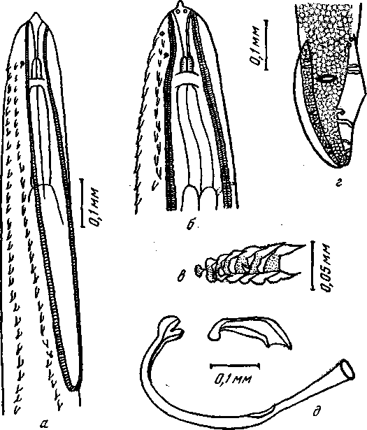 а — передний конец; б — головной конец латерально; в — деталь шипов; г— хвостовой конец самца; д — спикулы