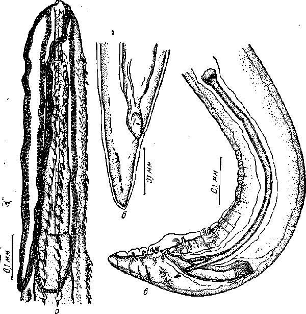 а — передний конец; б — задний конец самки; в — задний конец самца
