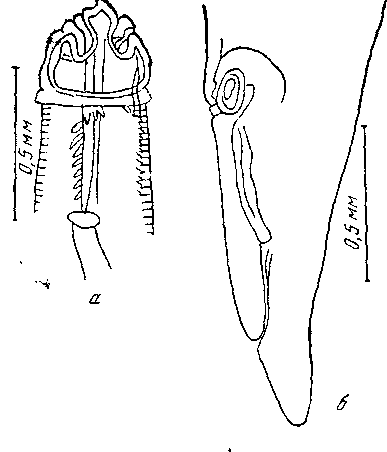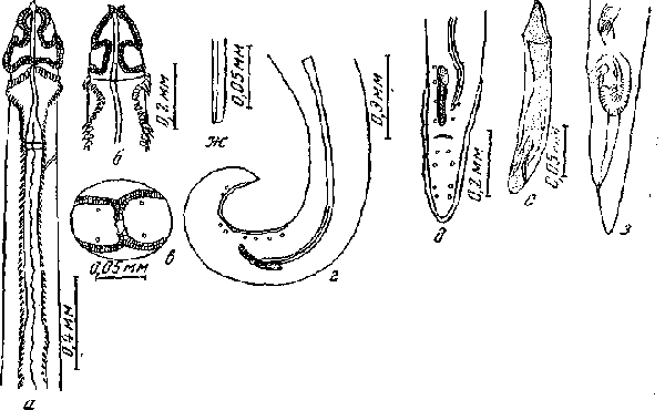 а — передний конец латерально; б — головной конец дорзально; в — головной конец апикально; г — задний конец самца латерально; д — хвостовой конец самца вентрально; е — малая спикула; ж — дистальный конец большой спикулы; з — задний конец самки
