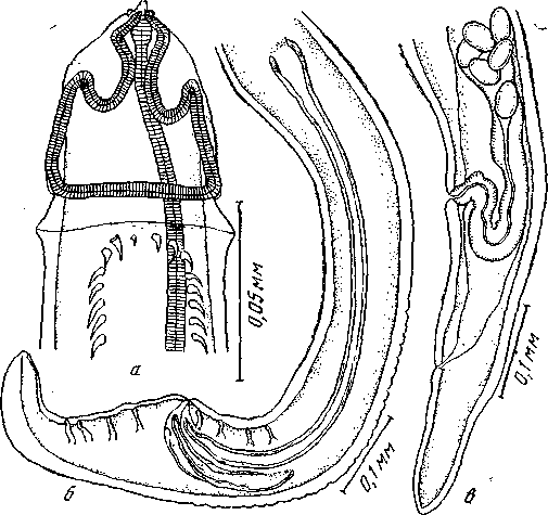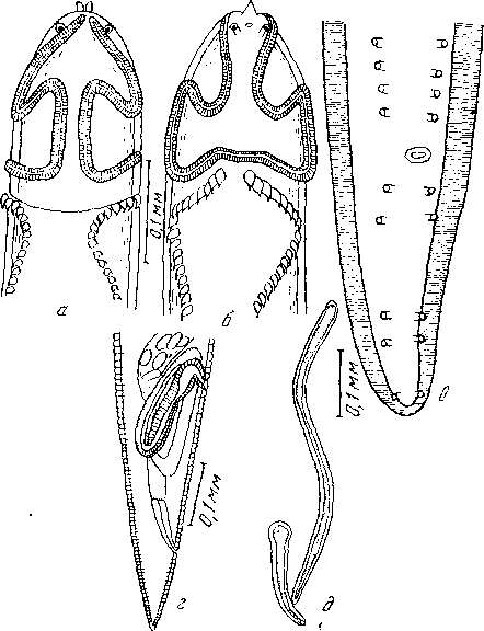 a — головной конец самки вентрально; б— головной конец самки латерально; в —хвостовой конец самца; г — хвостовой конец самки; д — спикулы