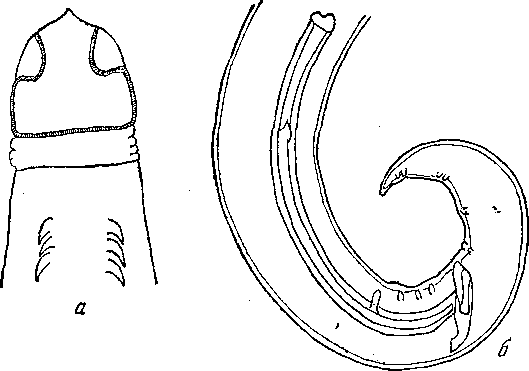 Самец. Длина тела 2,32—2,99 мм при наибольшей ширине 0,075— 0,100 мм. Ряды шипов начинаются на расстоянии 0,010—0,015 мм от кутикулярного воротника, заканчиваются на небольшом расстоянии от заднего конца тела. Точка соединения канатиков находится на расстоянии 0,029—0,038 мм от головного конца. Кутикулярный воротник имеет ширину 0,006 —0,008 мм. Длина фаринкса 0,113—0,139 мм, его ширина 0,008 мм. Общая длина пищевода равна 0,80—1,02 мм. Передняя, мышечная часть имеет длину 0,15—0,17 мм при ширине 0,017—0,025 мм. Задняя, железистая часть пищевода имеет длину 0,65—0,84 мм и ширину 0,035—0,046 мм. Нервное кольцо находится на расстоянии 0,147—0,164 мм от головного конца. Спикулы неравны и несходны. Большая, имеющая длину 0,227— 0,273 мм, изогнута и отчетливо разделена на две части: проксимальную, более хитинизированную и толстую, имеющую протяжение0,084—0,092мм и дистальную, менее хитинизированную и тонкую, трехгранную. Отношение между этими отделами 1 : 2,6—1 : 2,9. У своего основания спикула расширена и окружена нежной перепонкой. Малая спикула имеет длину 0,059—0,067 мм. Ее основание скошено; в дистальной ее части, на протяжении менее половины длины спикулы, имеется щель, по которой скользит большая спикула. Отношение длины спикул 1 : 3,7—1 : 4,5. Рулек отсутствует. Половая трубка направляется кпереди, делая на уровне мышечного отдела пищевода, где находится семенник, изгиб в форме буквы U и снова идет кзади. Хвостовой конец вытянутый, скрученный в спираль в 2—3 оборота. Хвостовые крылья имеются, развиты слабо. Хвостовые сосочки стебельчатые, короткие. Их 10 пар: 4 пары преанальных и 6 пар постанальных. Преанальные и две первые пары постанальных сосочков располагаются на более или менее равных расстояниях; третья и четвертая пары постанальных сосочков сближены, так же как пятая и шестая, которые расположены близ хвостового конца. Длина хвоста 0,071 — 0,109 мм, вершина его закруглена.