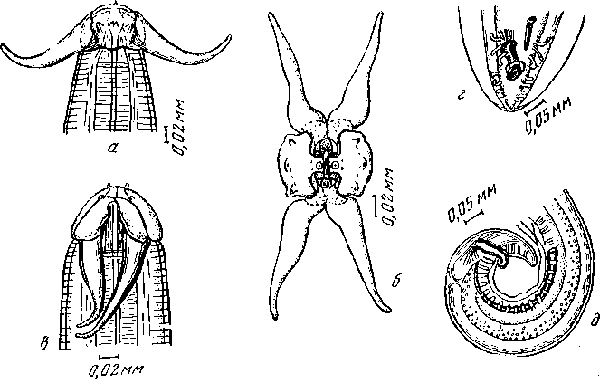 a — головной конец латерально; б — головной конец апикально; в — головной конец дорзально, г — хвостовой конец самца вентрально; д — задний конец самца латерально