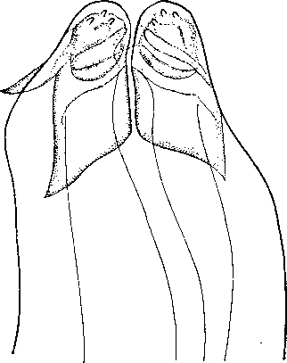 Самка. Тело 9 мм длины. Хвостовой конец короткий, уплощенный, загнутый позади ануса.