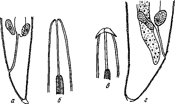 а и б — хвостовой и головной концы личинки (3,93—4,82 мм длины); в и г — головной и хвостовой концы личинки (6,3—6,6 мм длины)