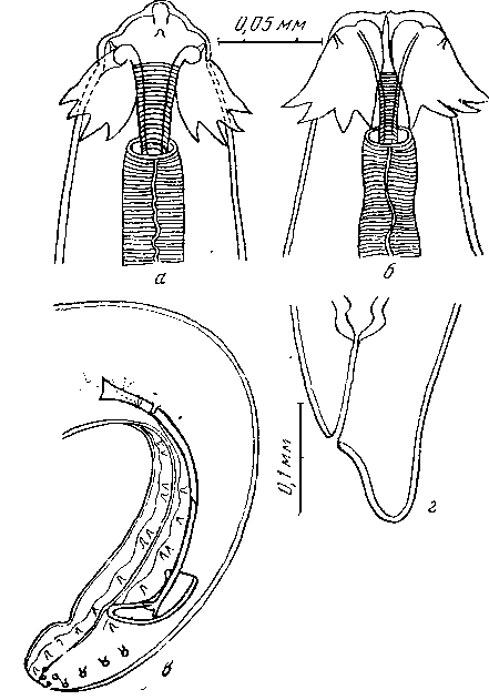 а — головной конец латерально; б — головной конец дорзально; в — задний конец самца; г — хвостовой конец самки