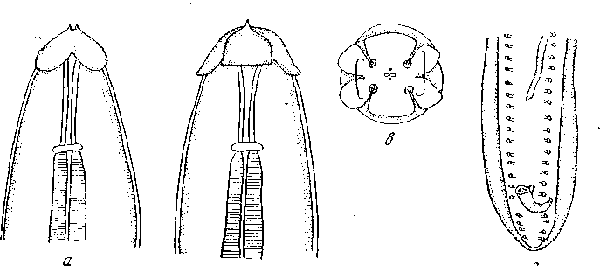 а, б — головной конец в разных положениях; в — головной конец апикально; г — хвостовой конец самца