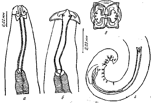 a — головной конец дорзально; б — головной конец латерально; в — головной конец апикально; г — задний конец самца