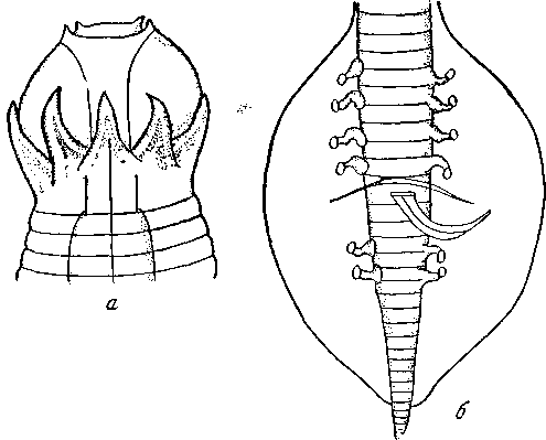 а — головной конец; б — хвостовой конец самца
