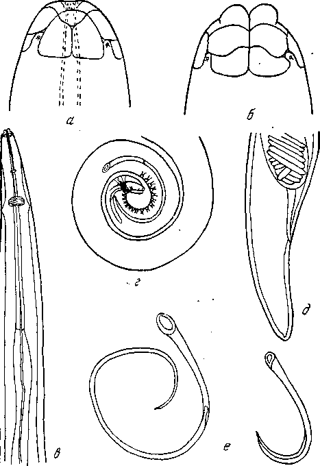 а, б — головной конец в разных положениях; в — передний конец; г — задний конец самца; д — задний конец самки; е — спикулы
