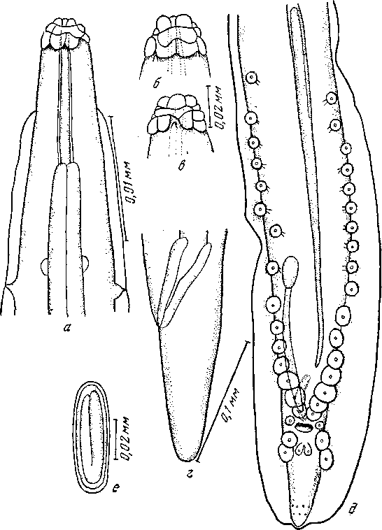 а, б, в — головной конец в разных положениях; г — хвостовой конец самки; д — хвостовой конец самца; е — яйцо