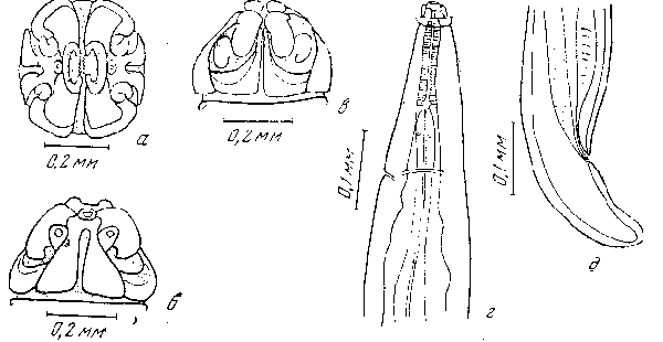 а — головной конец апикально; б— головной конец латерально; в —головной конец дорзально; г — передний конец; д — задний конец самки
