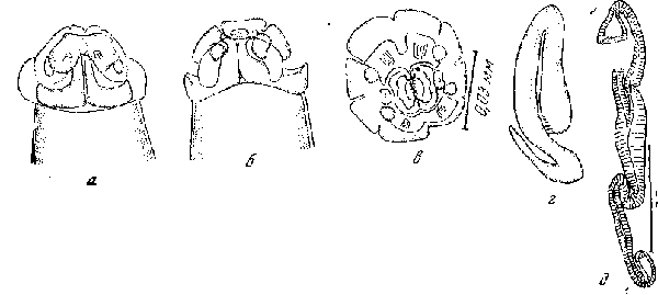 а — головной конец дорзально; б — головной конец латерально; в — головной конец апикально; г — личинки; д — яйцемет