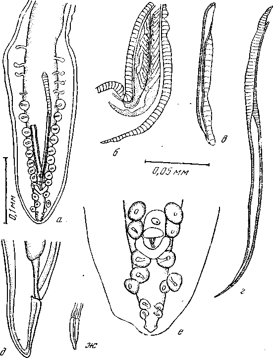 а — задний конец самца вентрально; б — сфинктер яйцемета; в — правая спикула; г — левая спикула; 3 — хвостовой конец самки; е - хвостовой конец самца; ж — рулек