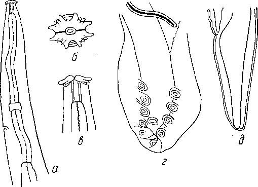 а - передний конец; б — головной конец апикально; в — головной конец дорзально; г — хвостовой конец самца; д — хвостовой конец самки