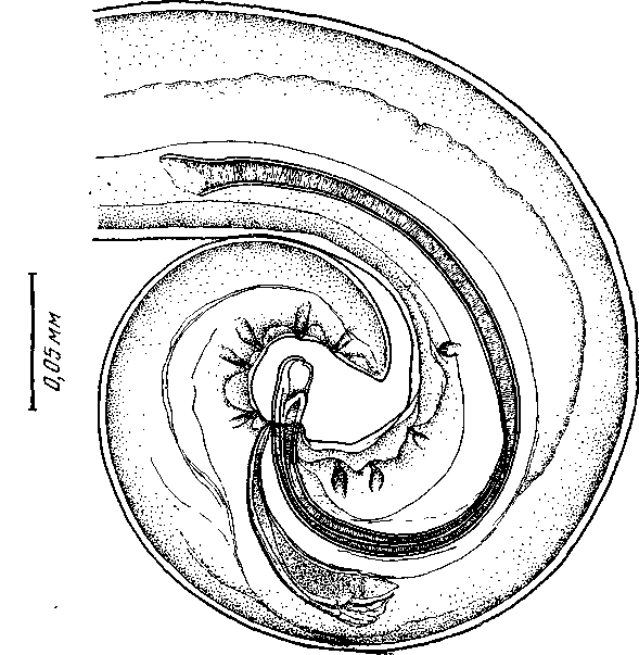 Самец. Длина тела 7,890 мм; длина выростов на головном конце 0,0217 мм. Расстояние от головного конца до нервного кольца 0,113 мм. Шейные сосочки расположены на расстоянии 0,096 мм от головного конца и 0,013 мм от нервного кольца. Длина фаринкса 0,052 мм. Длина мышечной части пищевода 0,609 мм; длина железистой части пищевода 1,575 мм. Хвостовой конец спирально закручен, снабжен узкими кутикулярными крыльями. Имеется девять пар стебельчатых сосочков; из них четыре пары преанальных и пять пар постанальных. Спикулы две, неравные, разной структуры; длина большей спикулы 0,283—0,291 мм, меньшей 0,087—0,091 мм. Расстояние от клоаки до конца хвоста 0,078 мм.