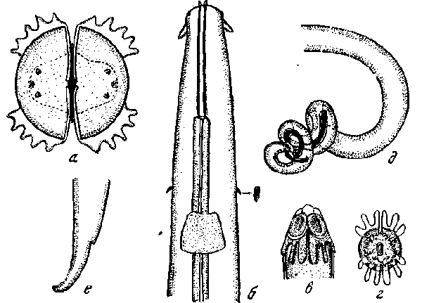 (а, б, д, е — по Уэр, 1934; в, г — по Драше, 1884) а — головной конец апикально; б — передний конец дорзально; в — головной конец латерально; г — головной конец апикально; д — задний конец самца; е — задний конец самки
