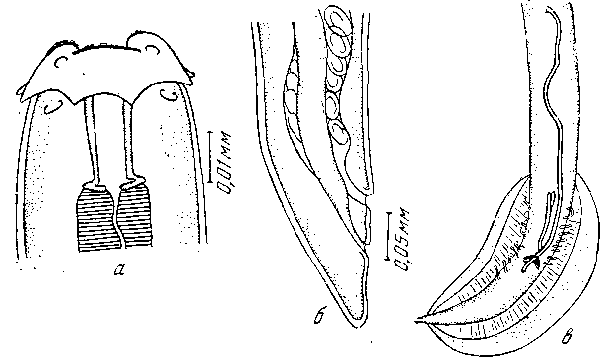 а, б — по Соболеву, 1949; в — по Сера, 1913) а — головной конец; б — задний конец самки; в — задний конец самца