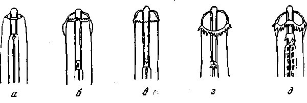 а — Rusguniella elongata (Rud., 1819); б — Aviculariella alcyona (Wehr, 1931); в —Proyseria decora (Dujardin, 1845) (по Шабо, 1953); г — Paryseria adeliae Johnston, 1938; d —Seuratia shipleyi (Stossich, 1907)