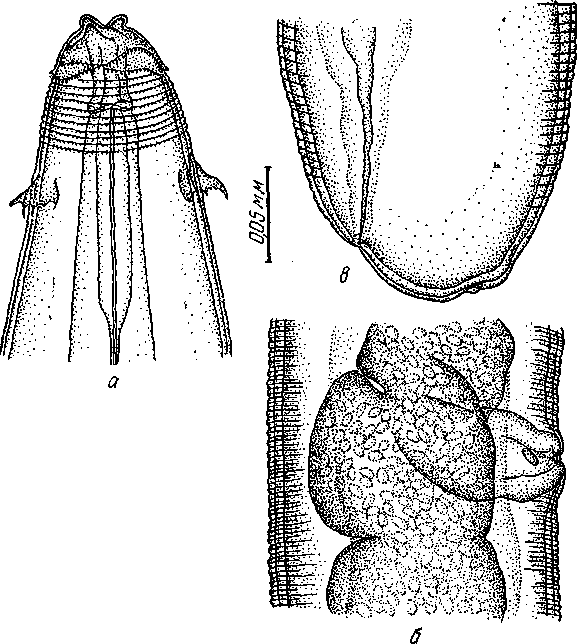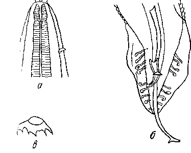 а — головной конец; б— задний конец самца; в — цервикальный сосочек
