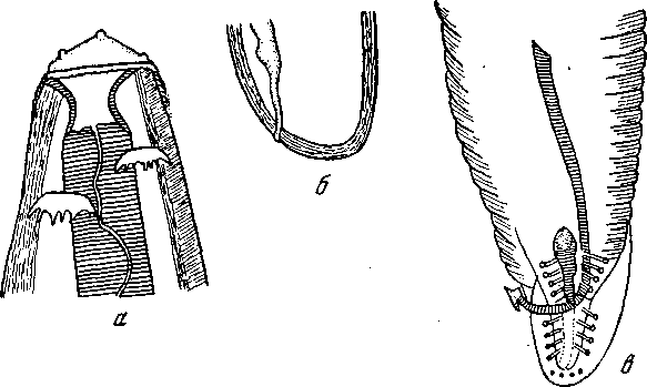 а — головной конец латерально; б— хвостовой конец самки; в—хвостовой конец самца