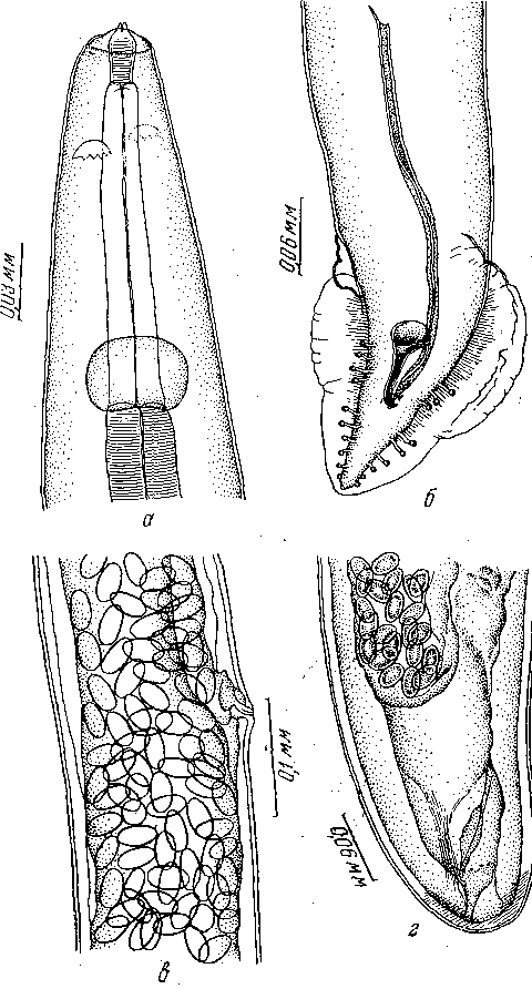 а - передний конец самки; б — задний конец самца; в — область вульвы; г — задний конец самки