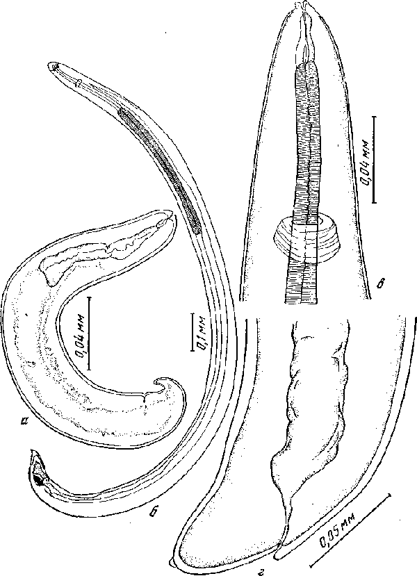 a - личинка первой стадии; б — личинка второй стадии; в —головной конец личинки третьей стадии; г — хвостовой конец личинки третьей стадии