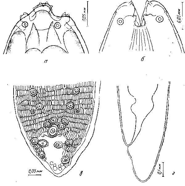 а—головной конец латерально; б—то же дорзо-вентрально; в — хвостовой конец самца; г — то же самки
