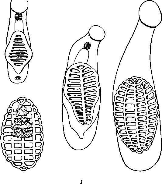 Aspidogaster conchicola К. Baer, 1827 (по Вельцкову, 1888). Разные стадии развития мариты