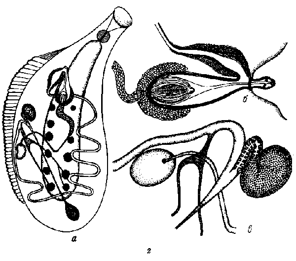 a — общпй вид; б — выводные половые протоки; в — семенник, яичник и их выводные пути