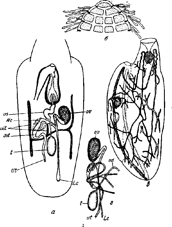 а— схема строения половой системы; б— детали диска Бэра; в— схема экскреторной системы; г—детали полового аппарата. ov—яичник; t—семенник; Me — тельпе Мелиса; vs—семенной пузырек; vit—желточники; oot—оотип; ut — матка; Lc— лауреров канал; vd— vas deferens