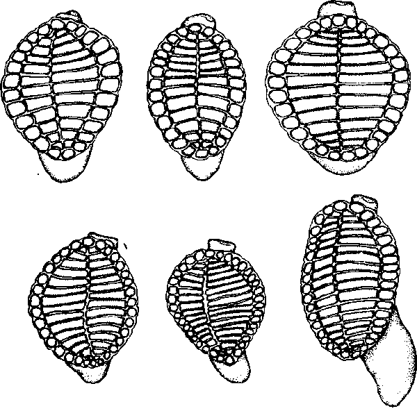 Aspidogaster limacoides Diesing, 1834 (по И. Быховской и Б. Быховско-му, 1934). Вариации в числе присасывательных ямок на диске Бэра