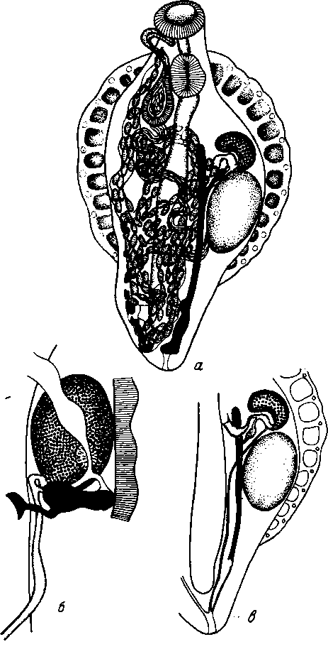 а—общий вид мариты; б—женская половая система (реконструкция); в—соотношение элементов мужской и женской половых систем