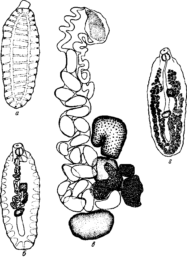 a— внешний вид диска Бэра; б— внутреннее строение паразита с половыми органами без желточников; в—половые органы и их выводные протоки; г — общий вид паразита