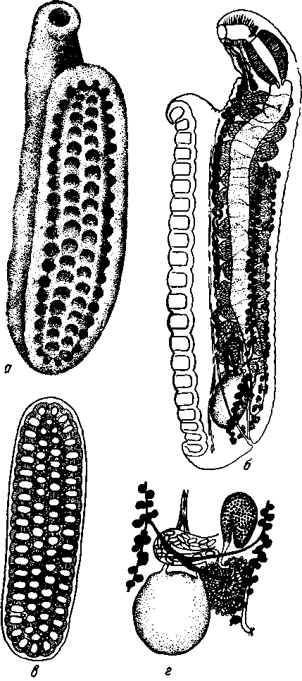 а— общий вид с вентральной стороны; б— вид сбоку; в— диск Бэра; г— детали половой системы