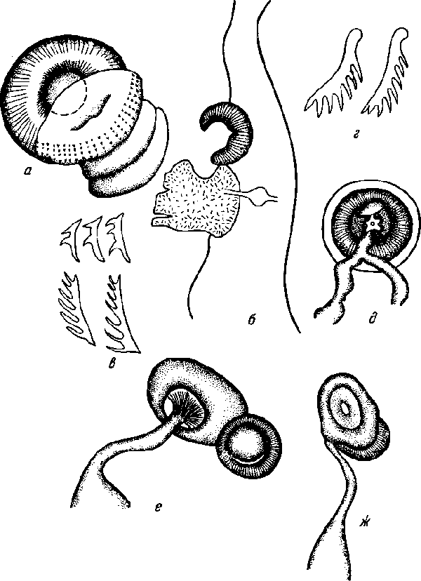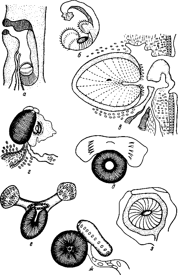 а— продольный paspes через генитальный синус Galactosomum humbergari Park, 1936; б—латеральный раэрез черев генитальный синус (по Парку, 1936); в— продольный разрез через генитальный синус Galactosomum corhleariformes (Rul., 1819) (по Пратту, 1911); е—брюшно-половая присоска Galactosomum puffii Yarnagnti, 1941 (по Ямагути, 1941); д—брюшно-половая присоска Parascocotyle amoldi (Travassos, 1928) (по Травассосу, 1928); е—брюшно-половая присоска Parascocotyle longa (Ransom, 1920) (по Витенбергу, 1929); ж— брюшная и половая присоски Pygidiopsis genata Loose, 1907 (по Вптснбергу, 1929); а— генитальный синус с брюшной присоской Centroce8tus formosanus (Nlshigorl, 1924) (по Ямагути,