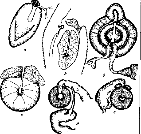 а— брюшная и половая присоски Dexiogonimus ciureanus Witenberg, 1929; б—то же в сагиттальном разрезе (по Витенбергу, 1929); в—брюшно-половой комплекс Cryptocotyle lingua (Creplin, 1825) (оригинал); а—брюшная и половая присоски Apophallus brevis Ransom, 1920 (по Листеру, 1940); д—брюшно-половая присоска и концевые отделы половых протоков Rossicotrema donicum Sfcrjabin et Lindtrop, 1919 (по Скрябину и Линдтропу, 1919); e—брюшно-половая присоска Pricetrema zalophi (Price, 1932) (по Прайсу, 1932)
