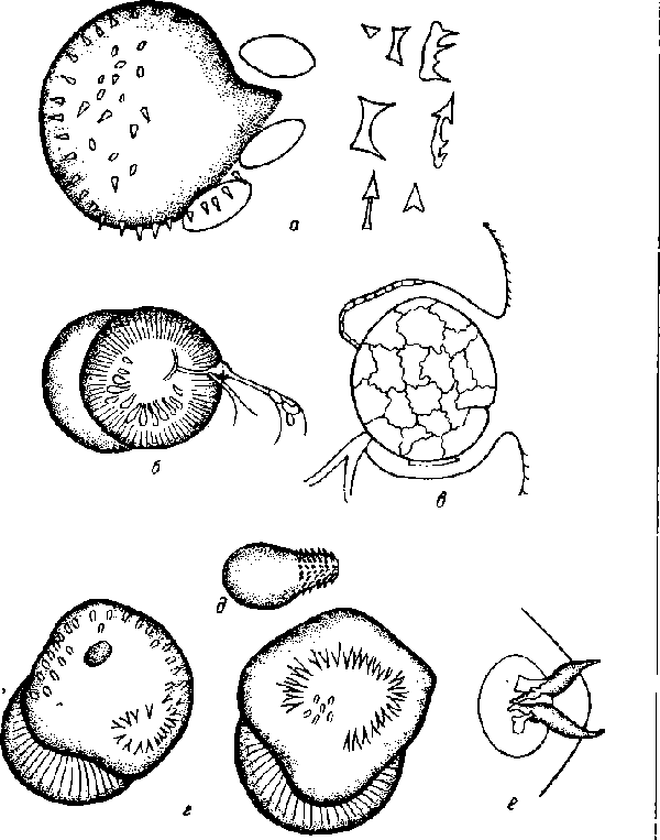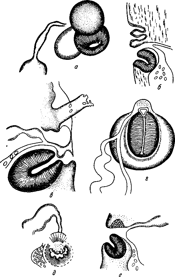 а— половая присоска и ее шипы Haplorchis pundlio (Looss, 1896) (по Чену, 1936); б—брюшно-половая присоска Haplorchis taichui (Nishigori, 1924); в—то же: продольный разрез через генитальный синус и половую присоску (по Витенбергу, 1929) г — брюшно-половая присоска Sobolephya oshmarini Morosev, 1952 (оригинал), д— половая присоска SticAodora sawakinensis Looss, 1899 (по Витенбергу, 192у), е — половая присоска AdlerieUa minulissima Witenberg, 1929 (по Витенбергу, 1929)