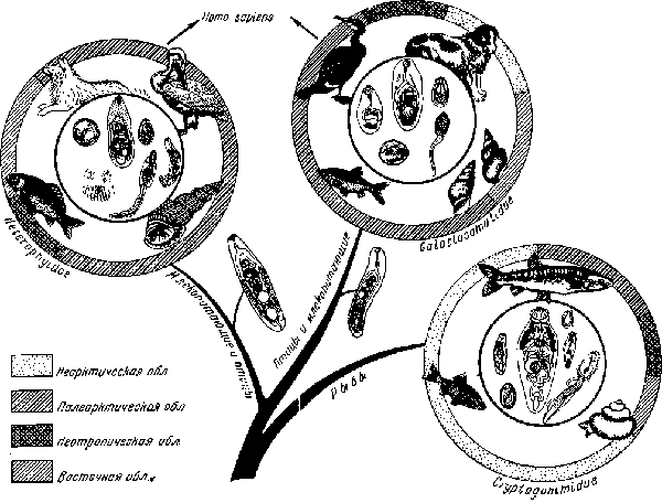 Наше предположение о происхождении половой присоски гетерофиоид от грушевидного органа турбеллярий подтверждается различным строением и расположением половых присосок различных представителей гетерофиоид. У одних этот орган имеет вид одного сосочка, расположенного около генитального синуса и не связанного с половыми отверстиями (Allocanthochasmus). У других этот орган заполняет генитальный синус, и половое отверстие открывается на его вершине (Heterophyes).