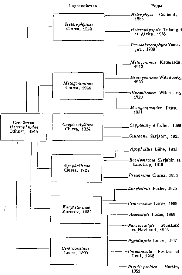 Классификация трематод семейства Heterophyidae Odhner, 1914 (по Ф. Н. Морозову, 1952)