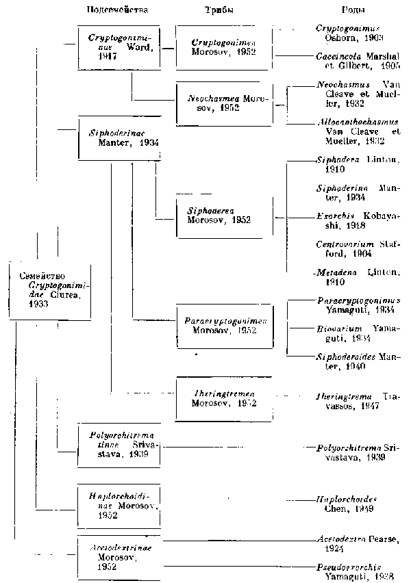 Классификация тррматод семейства Cryptogonimidae Ciurea, 1933 (по Ф. Н. Морозову, 1952)