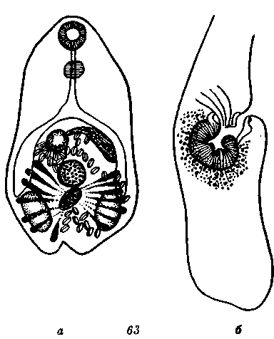 a — общий вид; б — брюшно-половая присосна.