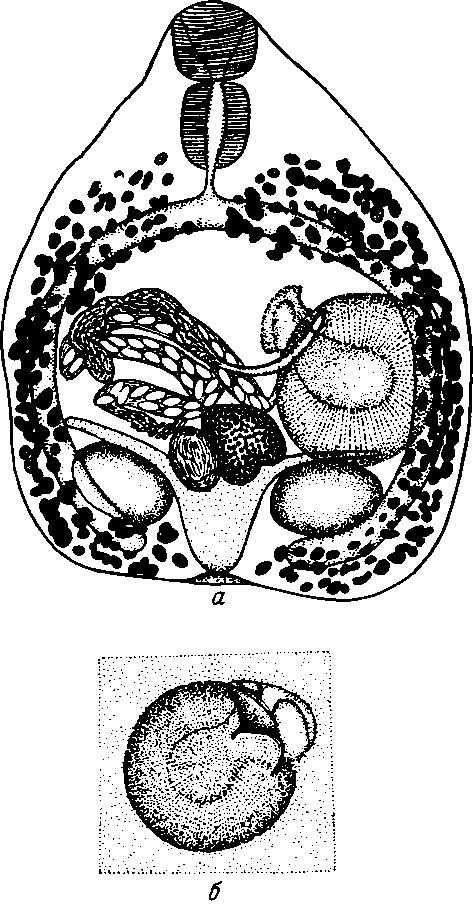 a— общий вид мзрнты; б— продольный разрез через генитальный синус