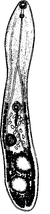 Между этими сосочками выходит самостоятельный семяизвергательный проток, впадающий в терминальную часть матки. На уровне этих половых сосочков открывается генитальное отверстие. Отверстие ротовой присоски ведет в фаринкс, имеющий эллиптическую форму, 0,044—0,048x0,017— 0,022 мм. Затем идет двойной пищевод, который разделяется на две ветви кишечника посередине расстояния между фаринксом и генитальным синусом, кишечные ветви тянутся до заднего конца тела.